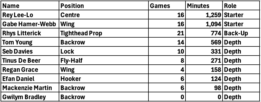 In Lee-Lo’s case he had the 20th most minutes played in the URC last season among centres. You would expect that to decline this year, and this isn’t a criticism of Cardiff as it seemed like he wanted to move on, but he still represents significant value to a team who needs consistency. Litterick sits in the other camp. He was signed from Quins with just Championship and Premiership Rugby Cup experience behind him but turned into a very good player in his two years with Cardiff and at just 26 he has now been picked up by Edinburgh, presumably for an amount Cardiff didn’t feel able to match. Mackenzie Martin is out only on loan so expect him to get back on track after a bit of a lost year.