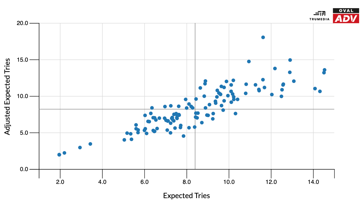 One way of measuring this is to look at a player’s Expected Tries and compare with their Adjusted Expected Tries.
